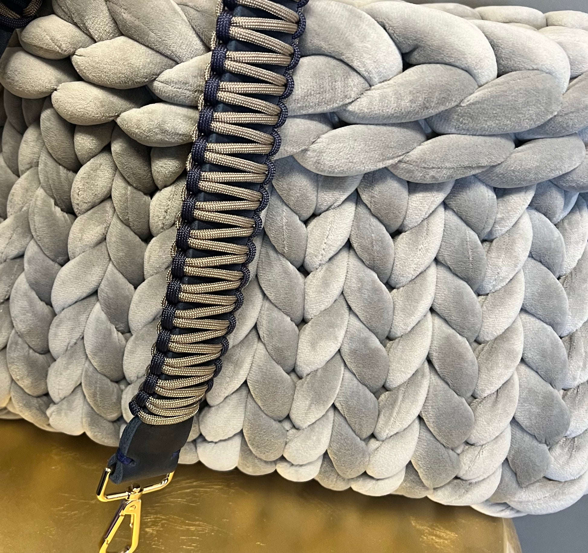 Chunky knit bag in light grey velvet, the Louisa & Zoe paracord strap has silver hardware;