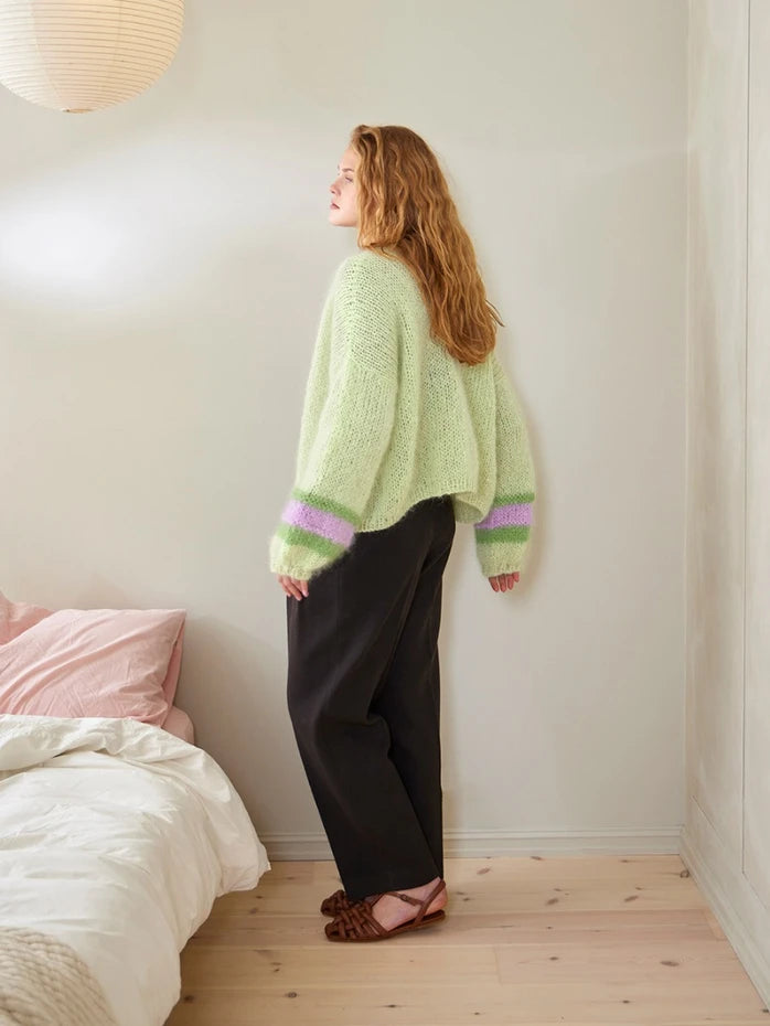 The jacket is knitted from top to bottom with double thread. First, cast on sts for the back piece. The back piece is knitted under the sleeves. Then, sts are knitted along each shoulder for the right and left sides of the front piece. Increase sts for the V-neck, and each front piece is knitted back and forth under the sleeves before they are joined to the back piece. The front and back pieces are knitted back and forth until the entire length and finished with a rib. sts are knitted around each armhole for sleeves. Sleeves are knitted in the round and decreases are made at the end for narrower sleeves before the rib is finished. Choose whether you want the sleeves to be knitted with or without stripes.