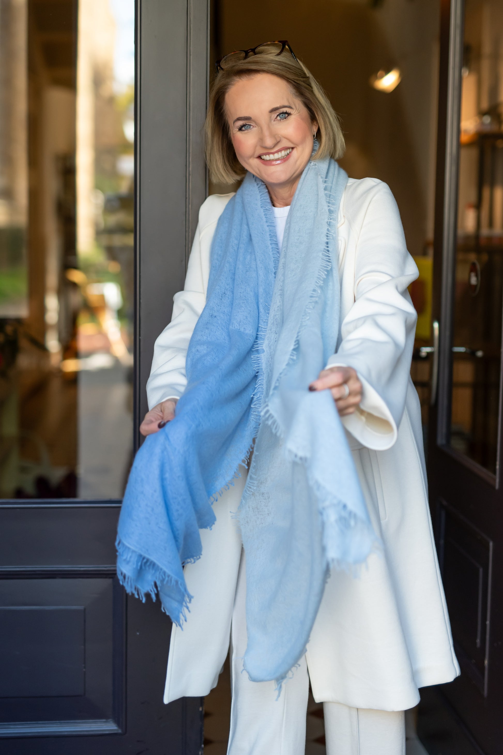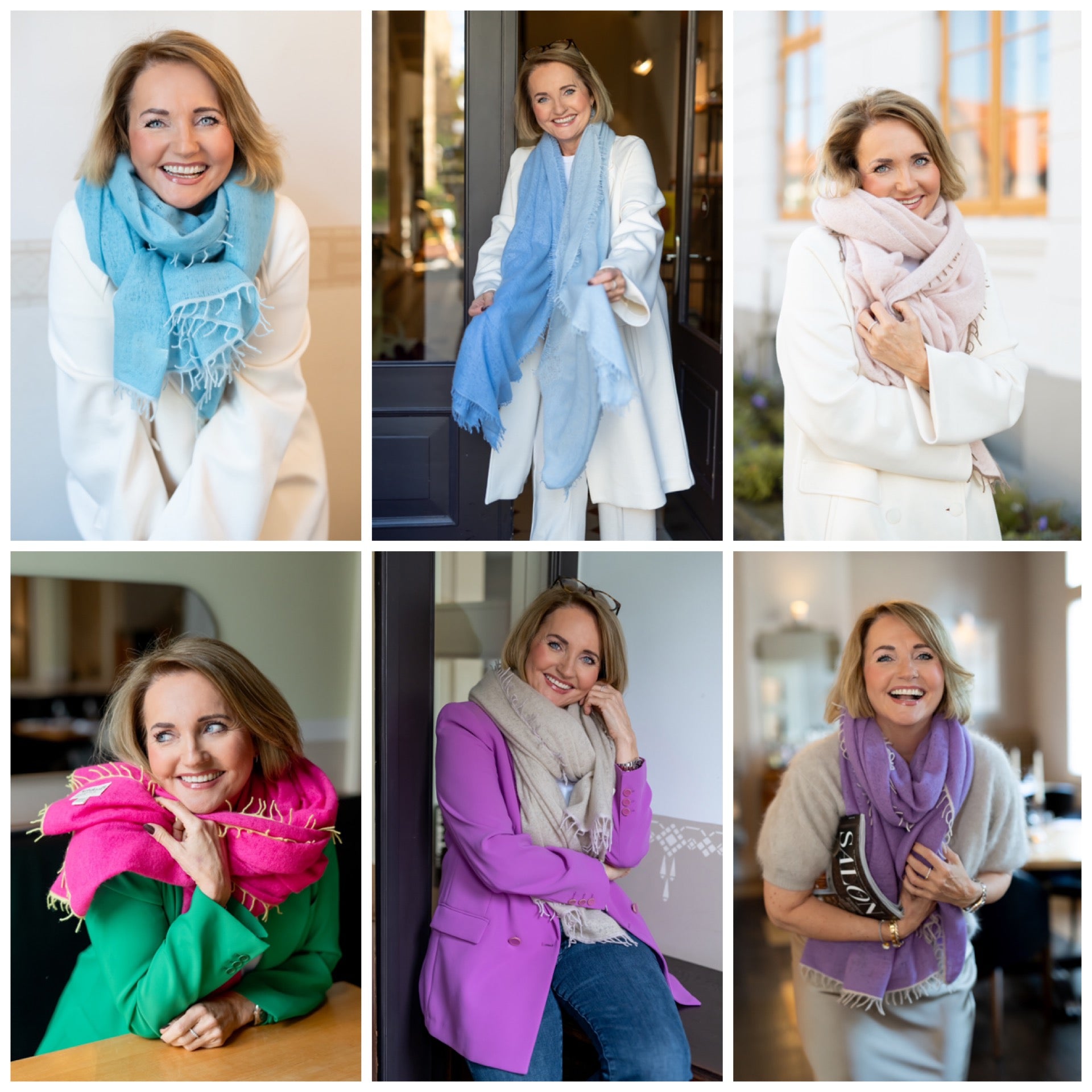 Wir haben sowohl softe, schmeichelnde Grundfarben, als auch richtige Knaller ausgesucht. Bis auf den himmelblauen und lila-Verlaufsschal, zeichnen sich alle Modelle durch eine handgerollte Fransenkante in einer Kontrastfarbe aus.