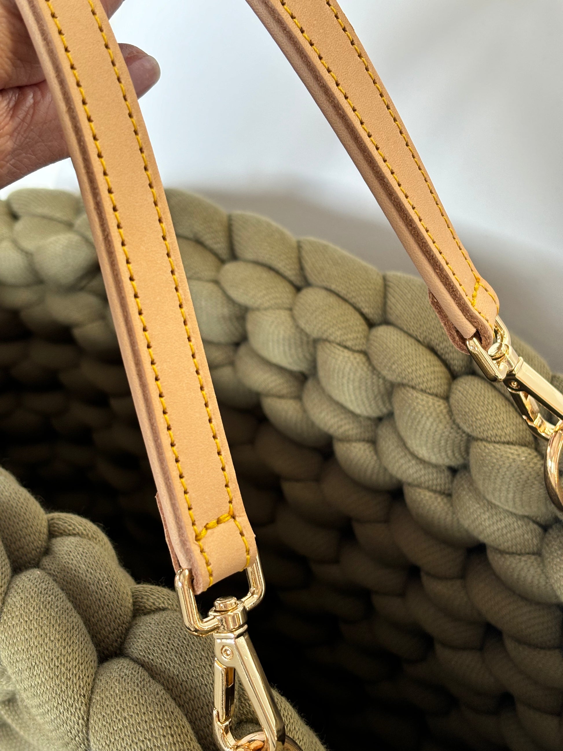 Handgestrickte Grobstricktasche, Modell Basket Bag in der Farbe Olive (Premium Cotton) und naturfarbigen Ledergriffen von OSDesign mit goldener Hardware. Wenn Du Dir eine andere Lederfarbe oder silberne Hardware wünscht, lass es und gerne wissen. Wir schlagen gerne etwas vor.