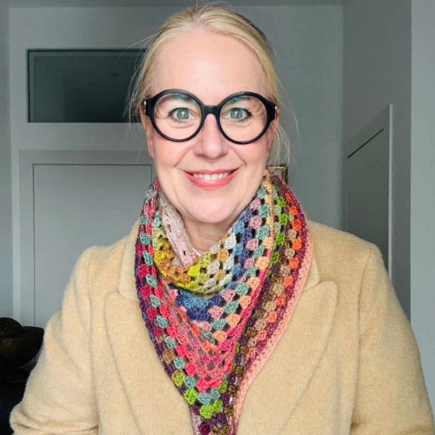 Sandra trägt auf dem Bild das Tuch aus Infinity von Langyarns in Farbe 03. Davon brauchs du nur 1 Knäuel.