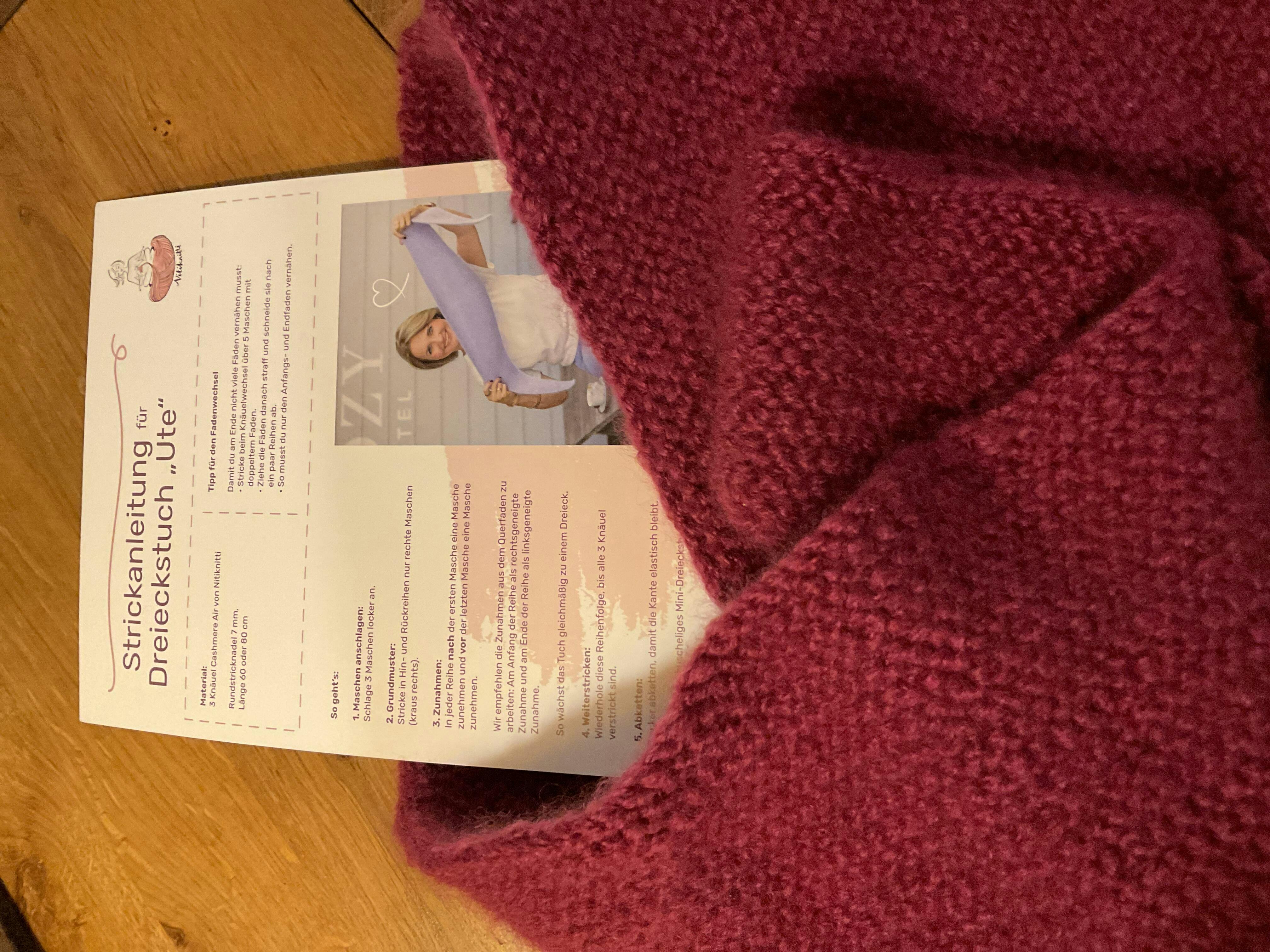 Das Dreieckstuch wurde aus 8 Knäueln Royal mit Nadel 8mm gestrickt. Nur rechte Maschen in Hin- und Rückreihen mit Zunahmen in jeder ersten Masche am Reihenanfang (rechts verschränkt). Wenn Du einen Wellenrand an das Dreieckstuch häkeln willst, nimm eine etwas kleinere Häkelnadel (6er) und umhäkele das Tuch wie folgt: immer zwei feste Maschen und die dritte als Mäusezähnchen arbeiten. Dafür erst eine feste Masche, dann 3 Luftmaschen und erneut in die feste Masche häkeln.