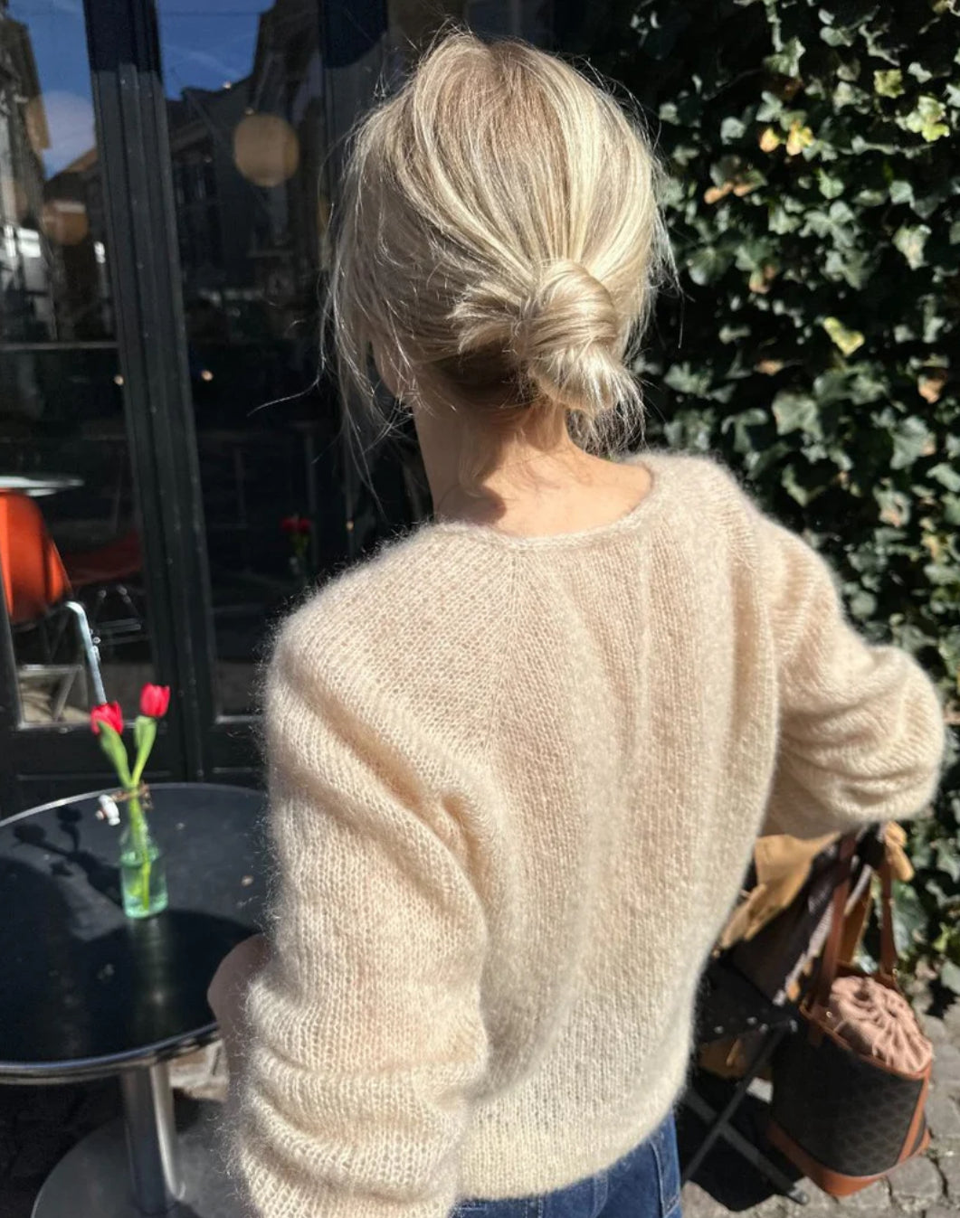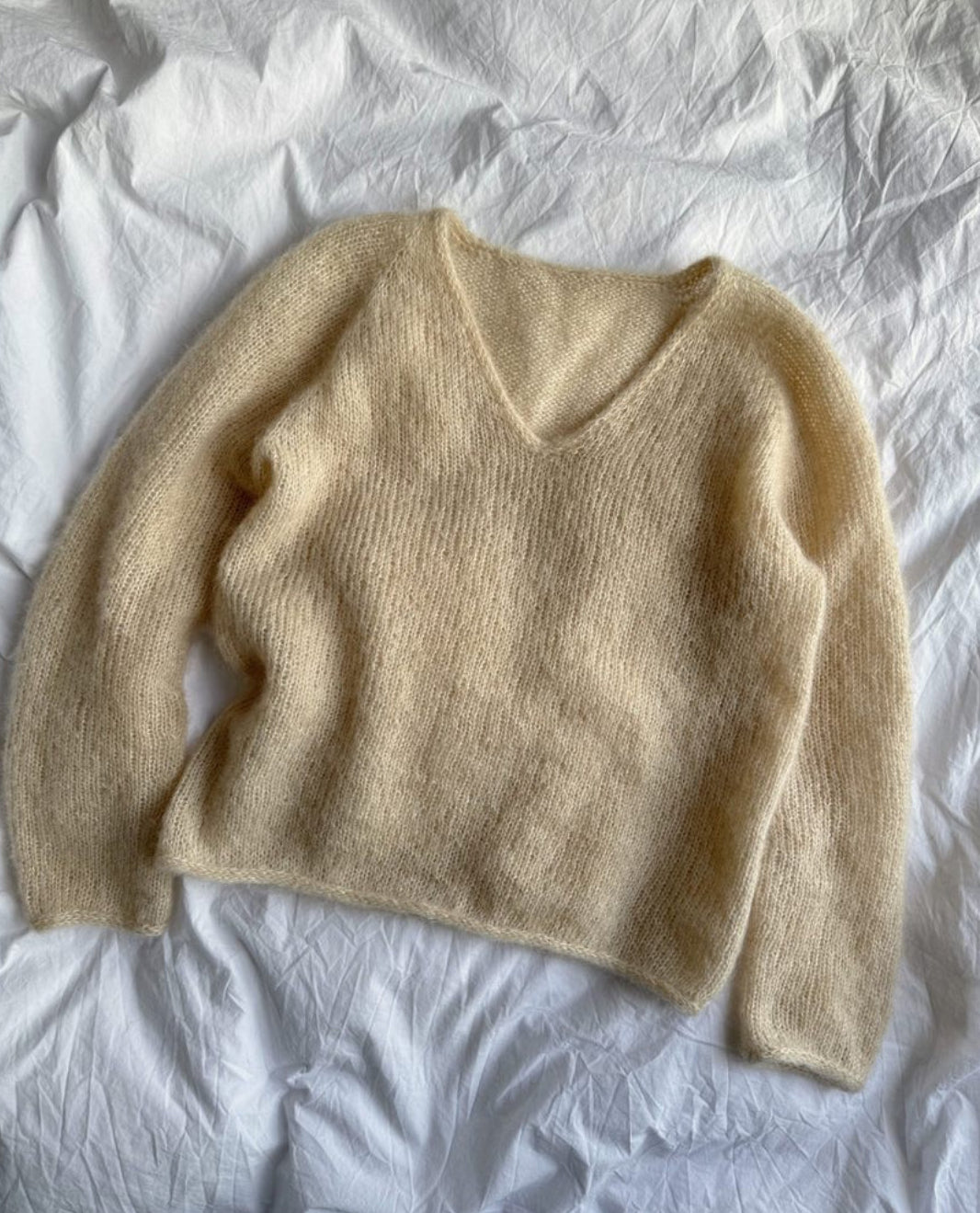 Material: 150 (175) 200 (200) 225 (225) 250 (250) 275 g Silk Mohair von Isager Yarn (25 g = 212 m) oder Tynn Silk Mohair von Sandnes Garn (25 g = 212 m) oder Brushed Lace von Mohair by Canard (25 g = 210 m) oder Soft Silk Mohair von Knitting for Olive (25 g = 225 m) oder Tilia von Filcolana (25 g = 210 m). Bedenke, dass der Pullover mit doppeltem Faden gestrickt wird. Der angegebene Garnverbrauch ist der Gesamtverbrauch.