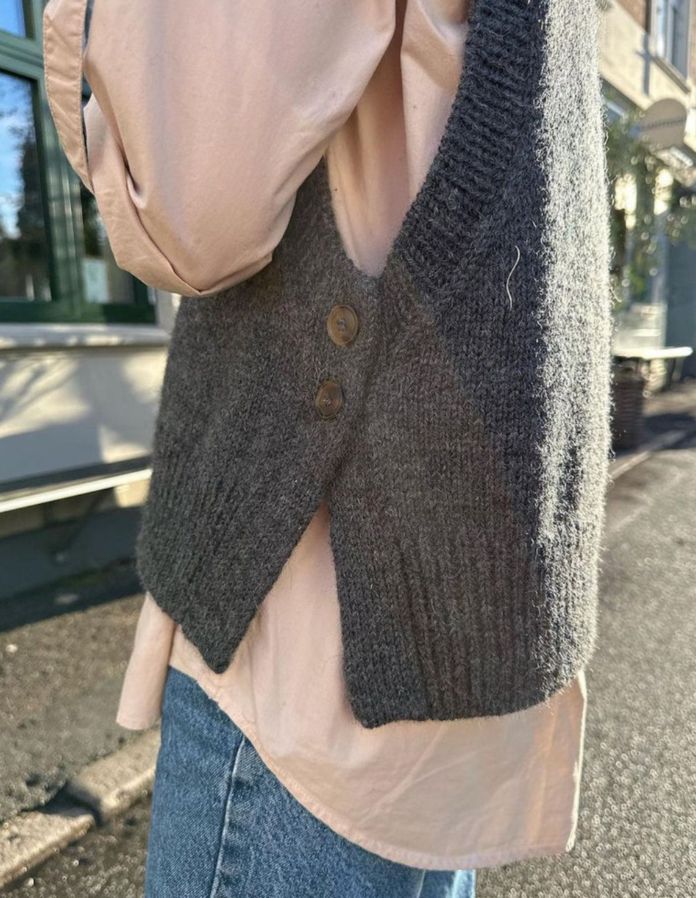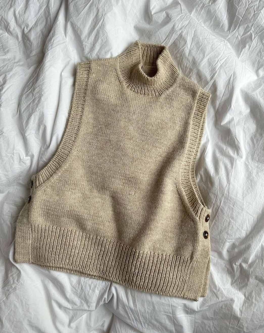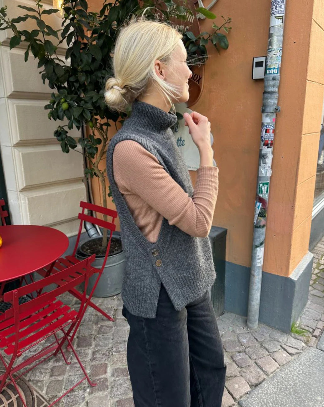 Der Lulu Slipover wird von oben nach unten gearbeitet. Der Pullunder besticht durch tiefe Armausschnitte, die an den Seiten mit je 2 Knöpfen geschlossen werden. Zuerst erfolgt die Rückseite, danach die Vorderseite. Entlang der Armausschnitte werden Rippenbündchen gefertigt und an den Seiten, die unten einen Schlitz bilden, werden Ränder im Doppelstrick gearbeitet. In den vorderen Rändern im Doppelstrick werden 2 Knopflöcher gefertigt. Zuletzt erfolgt ein Rippenbündchen am Halsausschnitt.