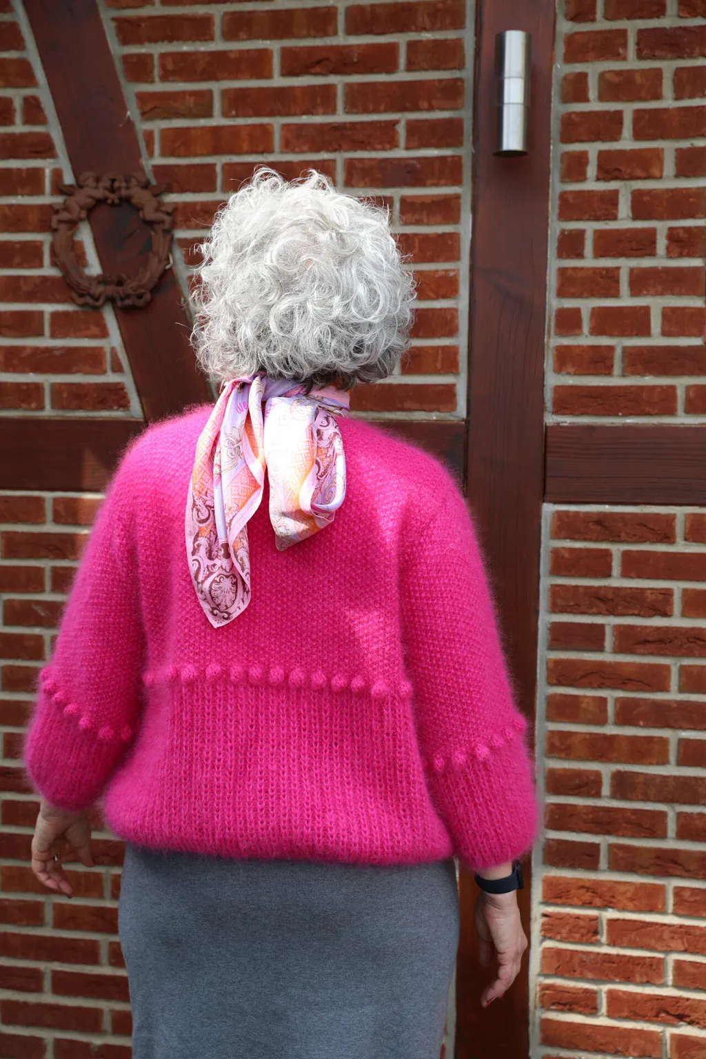 Anita trägt auf dem Foto den Big Fluffy Sweater aus einer Kombi von 1 Faden Malou Light und 2 Fäden Mohair Luxe