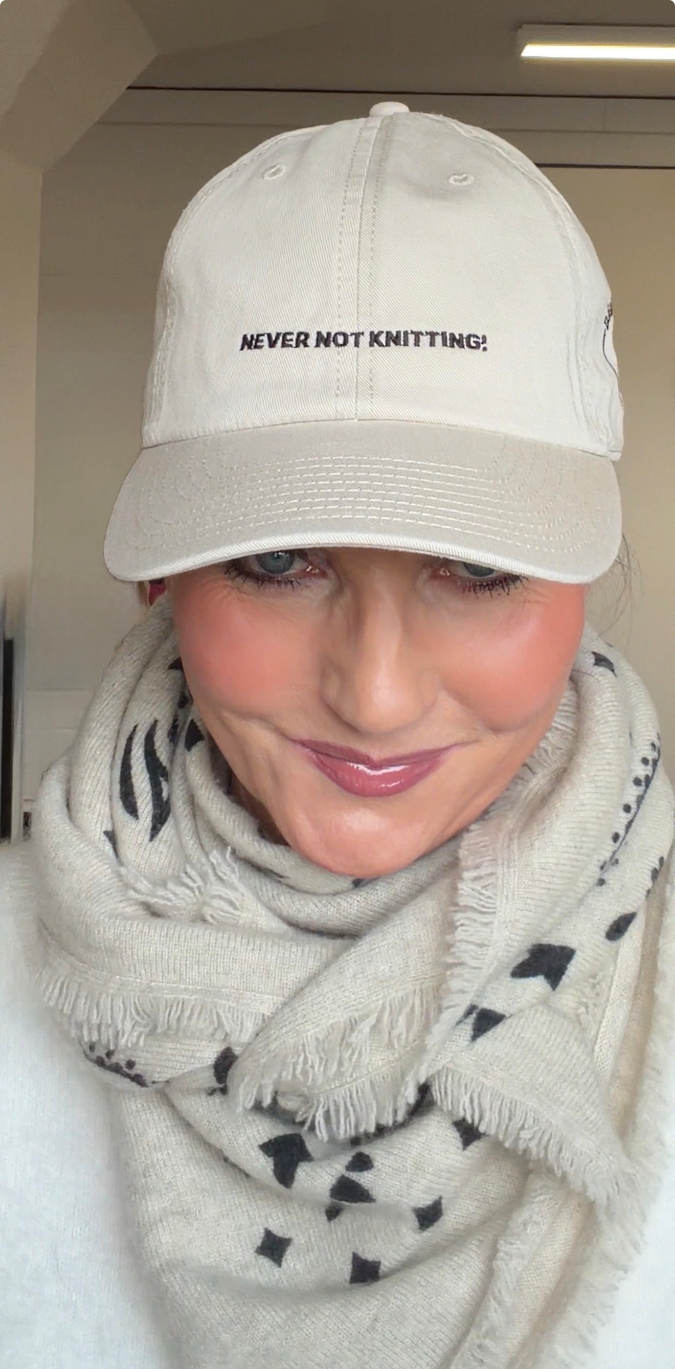 Größenverstellbare Baumwoll-Cap in drei Farben mit dem aufgestickten Spruch „never not knitting“ - das Motto einer jeden Strickliebhaberin! ❤️